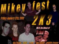 MikeyFest Teaser #1 (Flash) There was a lot of hype going around MikeyFest 2k3. It was the first time everyone (Rob, Ed, Mikey, Stick, D and me) got together at the same time. This Flash was used as fuel to the hype. It uses a couple of images that Rob created. It was something that I wanted to put together quick and dirty. View... |