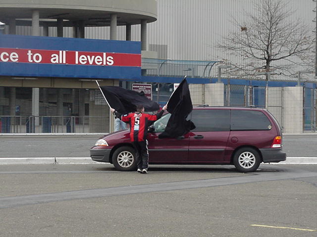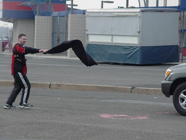 This is another great picture. I think Rob hopped up on one side of this minivan and then held on.