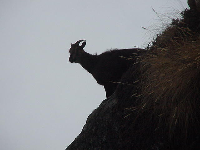 | We left Tengboche around 2pm and decided to try and push to get all the back to Namche Bazaar. We were really going to have to push ourselves to make it before sundown, but I really wanted to go back because the next day we had to go all the way back to Lukla. Making it to Namche would shorten our final trek. So we were pushing pretty hard on the way back- not much time for pictures! But I got this great one of a mountain goat looking down at us from the top of some cliff. I like how you almost just see the goat's dark shadow, against the pale blue sky. |