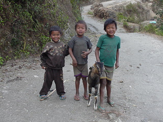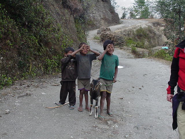 | I love this picture of these kids. They were amazed by my camera. I was amazed by their pet goat. I think it was the first time I ever saw someone with a goat on a leash. I think they expected me to pay them for taking their picture. Sorry guys. There's another picture of these kids making strange gestures with their hands around their eyes. I think they were imitating a camera. It was pretty funny. And yes, in case you were wondering, I do believe that flip-flops are the official footwear of Nepal. |