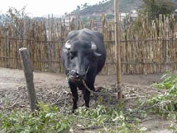 | We spent New Years Eve watching some local group of musicians. They sang and danced and played their drum. It was surely a unique night. But it was just nice being out in the mountains with Andrea. It was also good catching up on some sleep! The following day, we took a day hike out to a stupa, which is some sort of religious monument. Along the way, we ran into our share of interesting animals, like this yak/cow inbred. It was amazing walking through these dirt poor villages and looking at the houses, the people, the surroundings. |