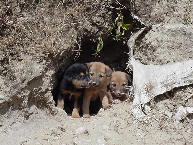 walking around. This picture shows a trio of new born puppies we found sticking their head out of a hole, waiting