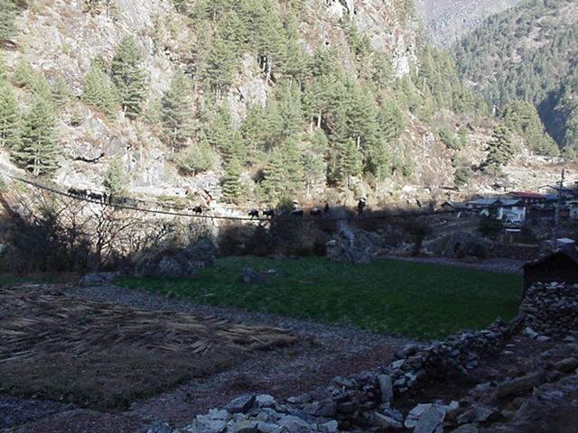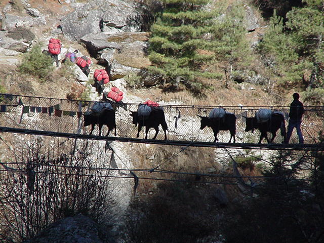 | Even the yaks have to use the bridges. And those are some rather large animals. Some of these yaks groups had more thans ten yaks. Luckily we never got stuck behind any yaks while we were crossing, especially since I wanted to cross as soon as possible. I serioulsy felt like Indiana Jones when he had to cross that long bridge. Luckily, none of our bridges collasped, but I still intently gripped the cables on the side of the bridges as I crossed. Notice the yaks in the background with the bright red duffle bags strapped to them, climbing up the mountain path. |