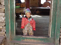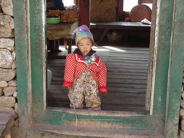 This girl was just standing by her front door when we walked past her house. Notice the little whipping thing in her right hand. She must be starting early to lead a crew of yaks. I love the clothes she's wearing though. It's pretty typical of what we saw. People in the mountains seemed to wear whatever was around. This was in stark contrast to the city of Kathmandu, where you had some people walking around like this, but others walking around in in suits and ties and sunglasses. It's funny. |