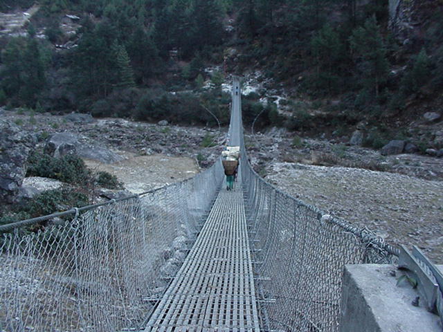 | Another classic picture. I think we ended up crossing about ten bridges or so. Some were short, some were long, some were over land, some were over roaring rapids, some were made of steel, some were made of rotting wood. Needless to say, it was an experience anytime we got to one. Our Sherpas knew that I wasn't to keen on heights, so one of them held my hand every time we came to a bridge. This bridge is great because it's probably the longest one we crossed. You can see how much it dips down. |