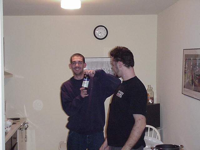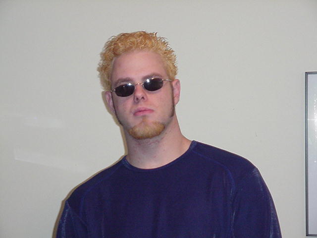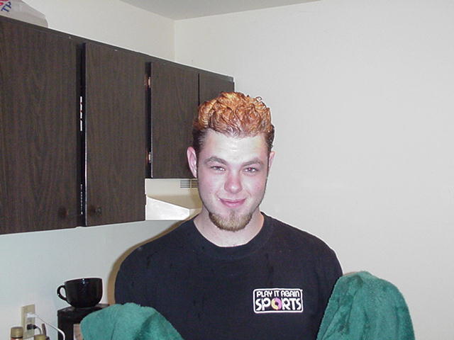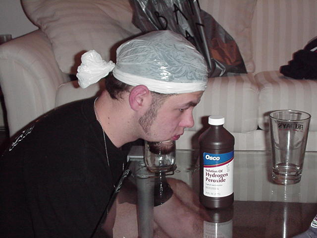 | I'm not sure who actually gets credit for the idea of dying Rob's hair blonde, but all I know is that Rob surprising agreed to it without even thinking. We tried in vain on Friday night to do it. All we were armed with was a bottle of peroxide and the knowledge that it somehow makes your hair blonde. So Rob ran some peroxide through his hair, made this bag to fit over his head and keep the heat in, and he also dipped his goatee into a nice tall glass of peroxide. |