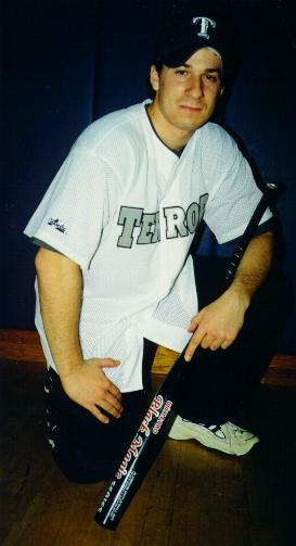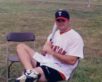 | When the Tri-State Terror began pitching, we simply could not follow the ball coming down the plate. It was coming down too fast and too hard. For a while we weren't swinging, simply because we had no choice. One of their teammates, Frank (shown here in the picture), began getting angry at us. He began yelling, "Swing the f***ing bat!" We ignored him and continued to play our game. The barrage of expletives failed to cease and our crowning moment came when Doug cranked a grand slam out of the stadium. It was an awesome moment. We weren't winning, but we weren't sinking either. We were going out with a big, fat exclamation point. |